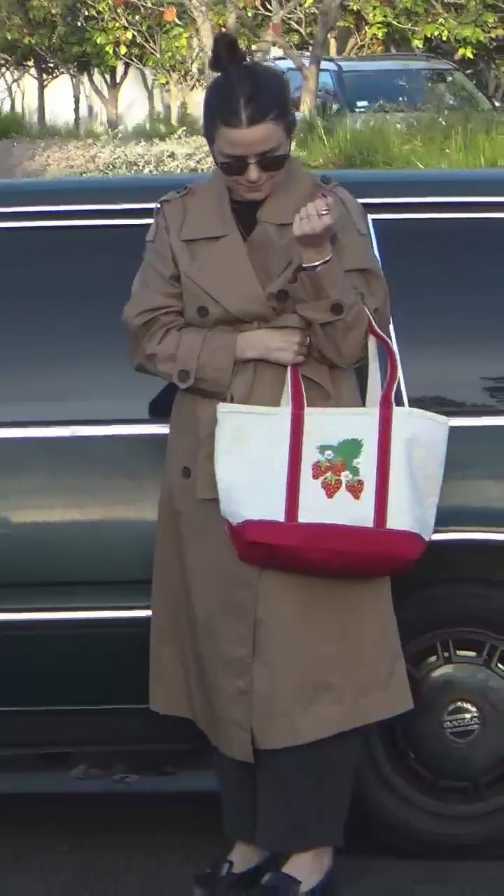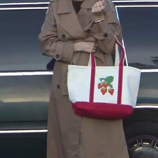 Strawberry design embroidered directly onto tote, in addition to embroidered accent on other side, located above external pocket.